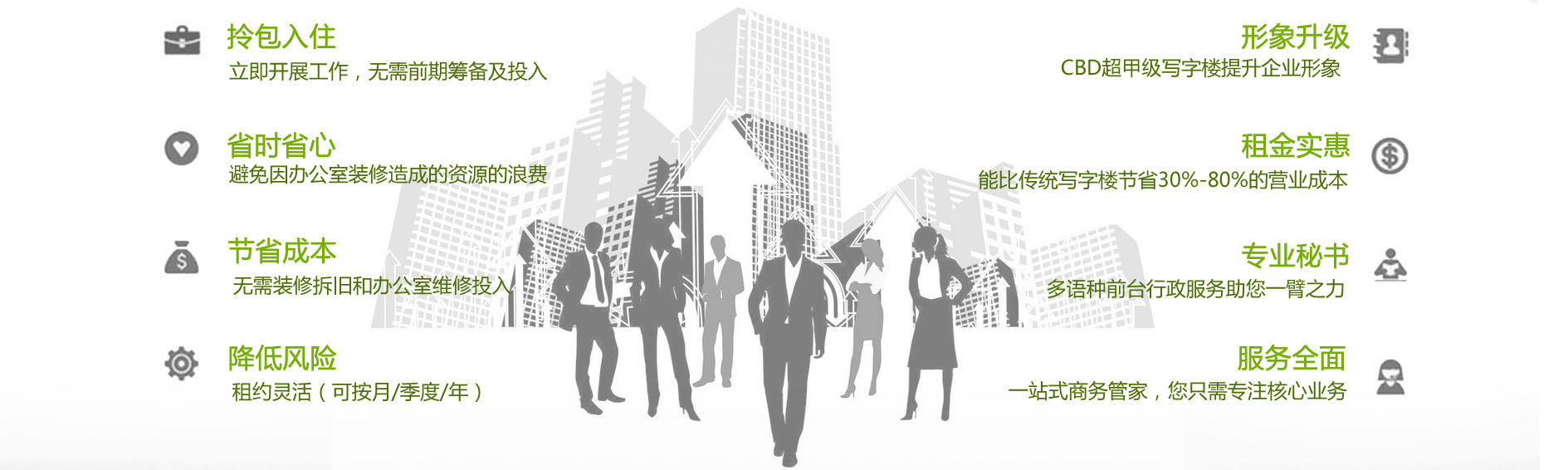 在邦勝創(chuàng)業(yè),無(wú)需再額外聘請(qǐng)前臺(tái)文員及行政事務(wù)人員,也無(wú)需額外支付房租、物業(yè)管理費(fèi)、中央空調(diào)費(fèi)、水電費(fèi)、寬帶網(wǎng)絡(luò)費(fèi)、保安保潔費(fèi)及茶水飲品費(fèi)。比租用傳統(tǒng)寫(xiě)字樓節(jié)約費(fèi)用30% - 80%以上。