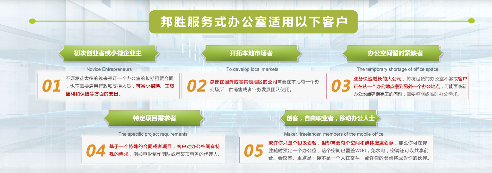 在邦勝創(chuàng)業(yè),可免費(fèi)獲得前臺(tái)商務(wù)秘書(shū)提供的來(lái)客接待、來(lái)電轉(zhuǎn)接、文書(shū)打印、掃描傳真、快遞包裹、商務(wù)預(yù)訂等基本服務(wù);還可根據(jù)自己的經(jīng)驗(yàn)和業(yè)務(wù)發(fā)展的需要,選擇邦勝提供的工商登記、證照代辦、資質(zhì)申請(qǐng)、記賬報(bào)稅、網(wǎng)站建設(shè)、市場(chǎng)推廣、管理咨詢(xún)、營(yíng)銷(xiāo)策劃、法律援助、融投資等專(zhuān)業(yè)定制服務(wù)。
